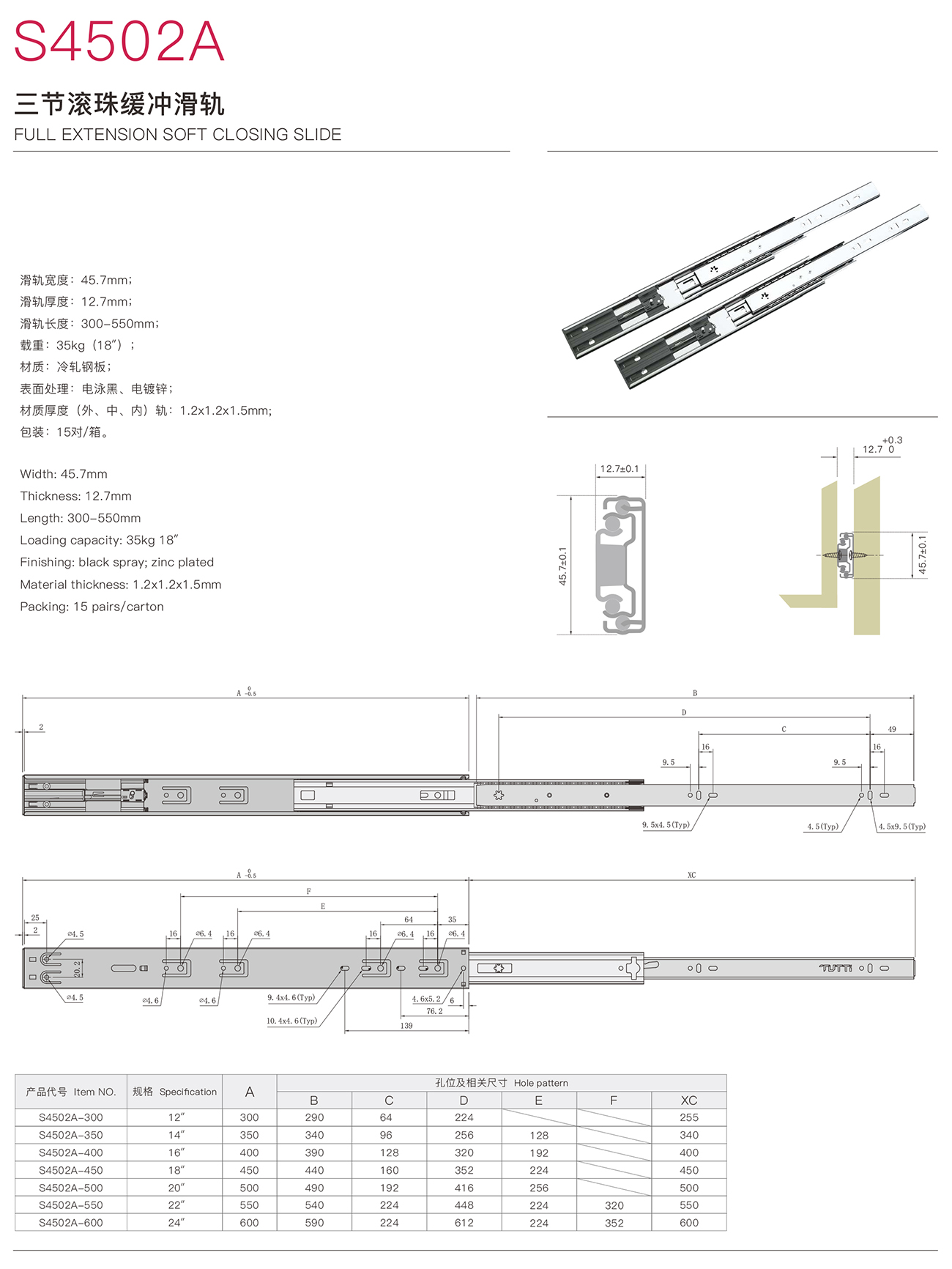 S39P601隱藏式三節(jié)反彈緩沖帶把手同步滑軌