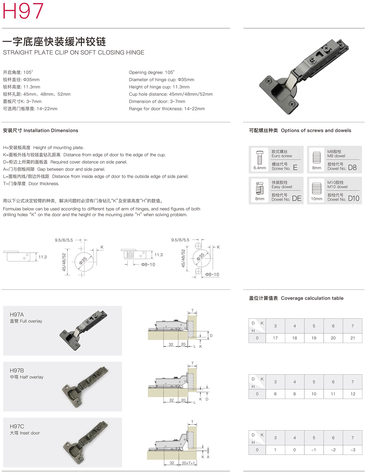 H97一字底座快裝緩沖鉸鏈