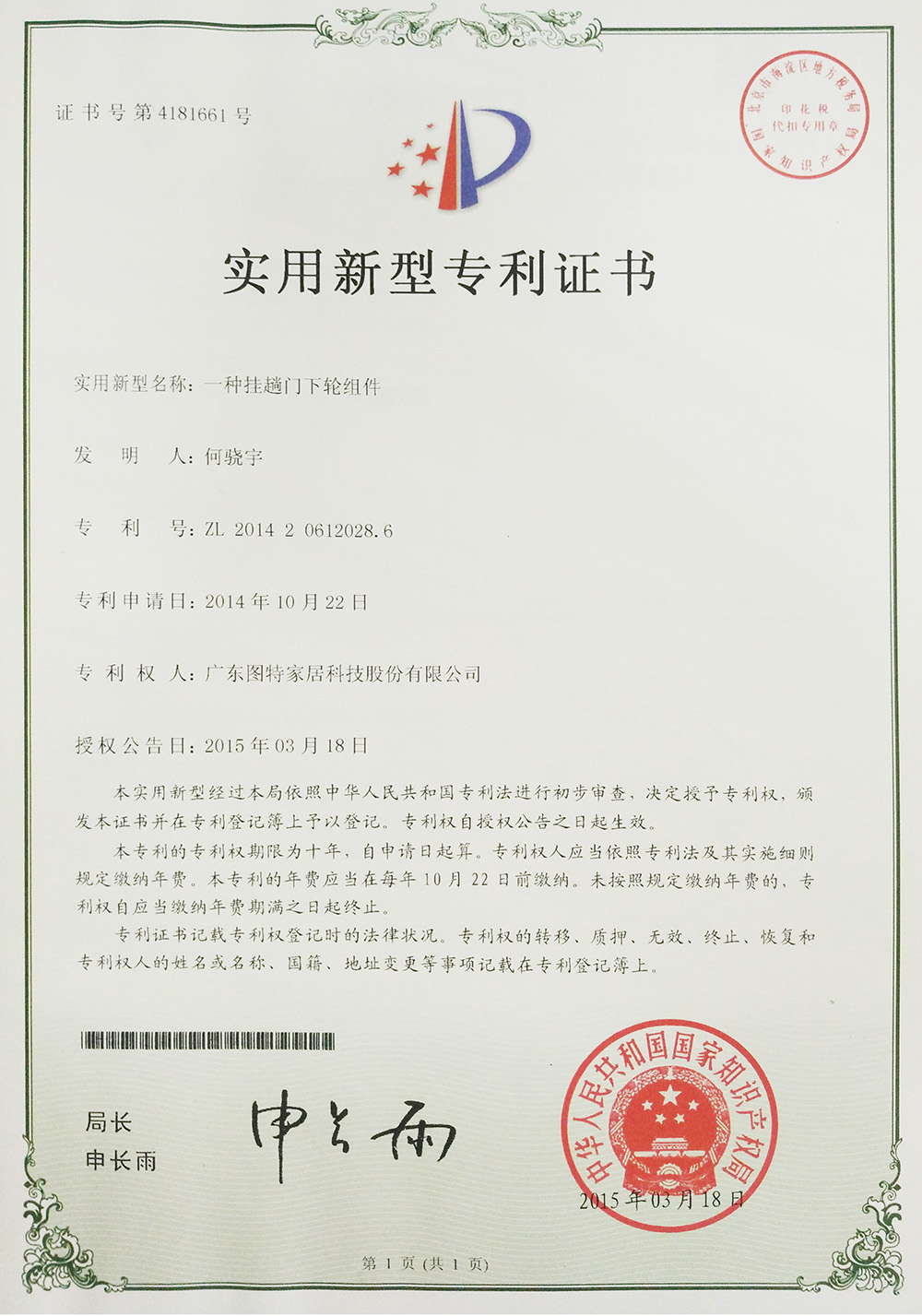 實(shí)用新型專(zhuān)利(一種掛趟門(mén)下輪組件)