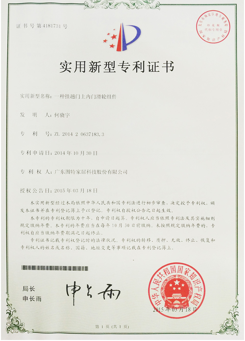 實(shí)用新型專(zhuān)利(一種掛趟門(mén)上內(nèi)門(mén)滑輪組件)