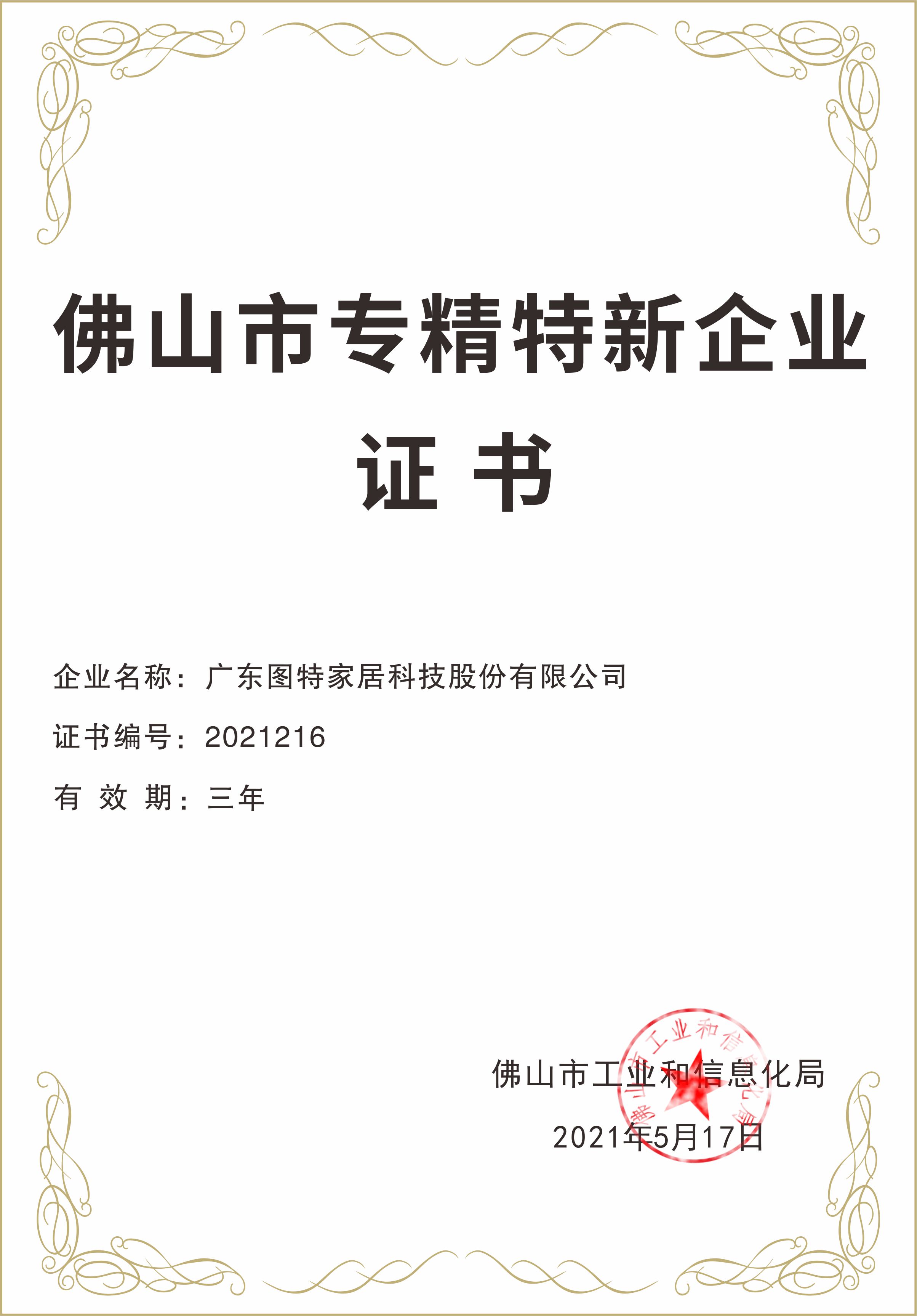 佛山市專(zhuān)精特新企業(yè)證書(shū)