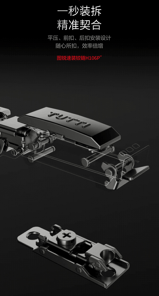 H106P圖銳速裝鉸鏈憑借“一秒裝拆”的極簡快裝設計和專利阻尼技術,解決了高柜門安裝效率與靜音閉合的行業(yè)痛點,成為全球客戶熱議的“效率革命”。